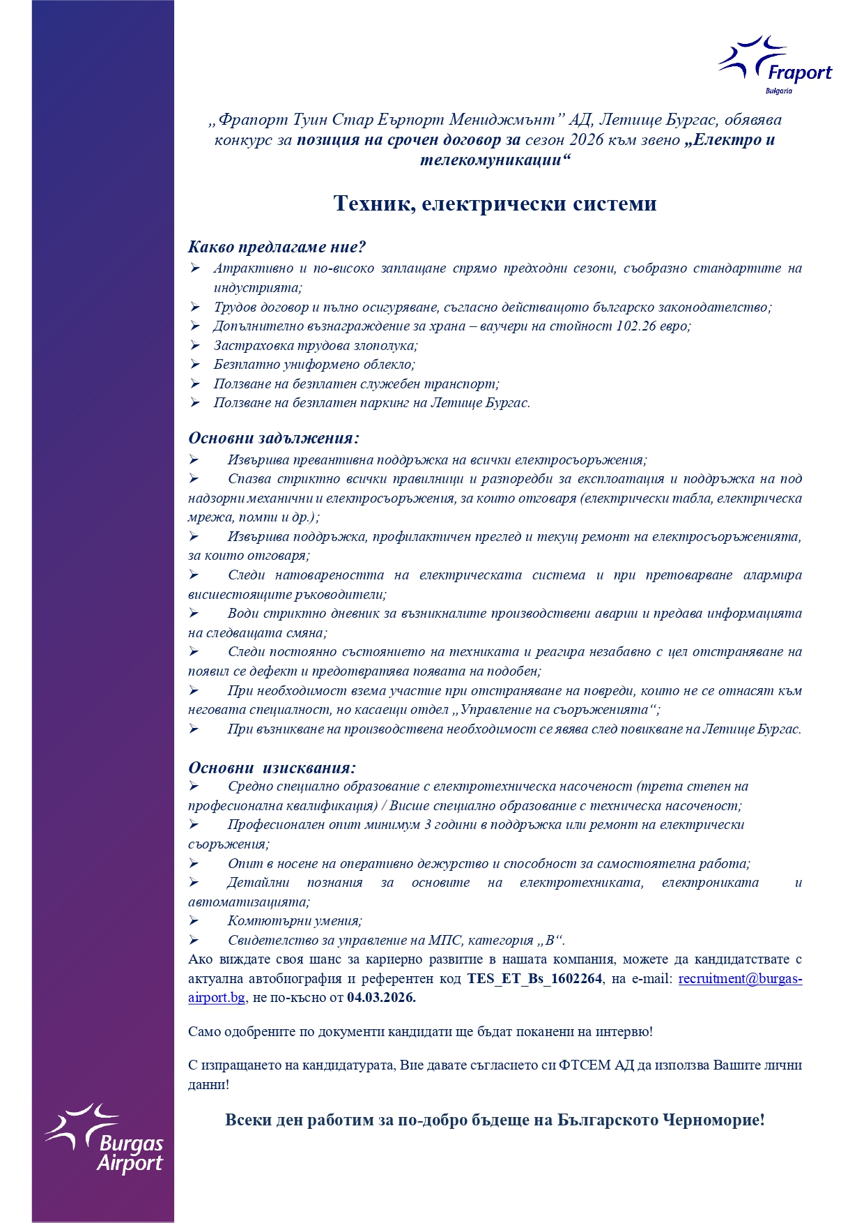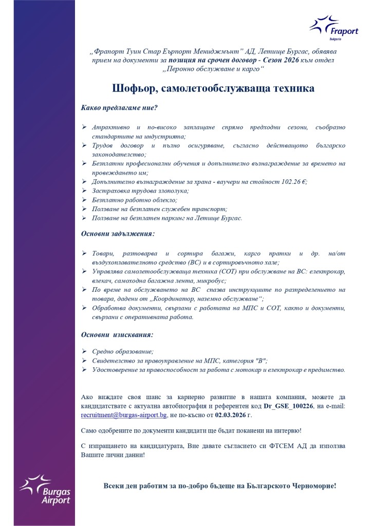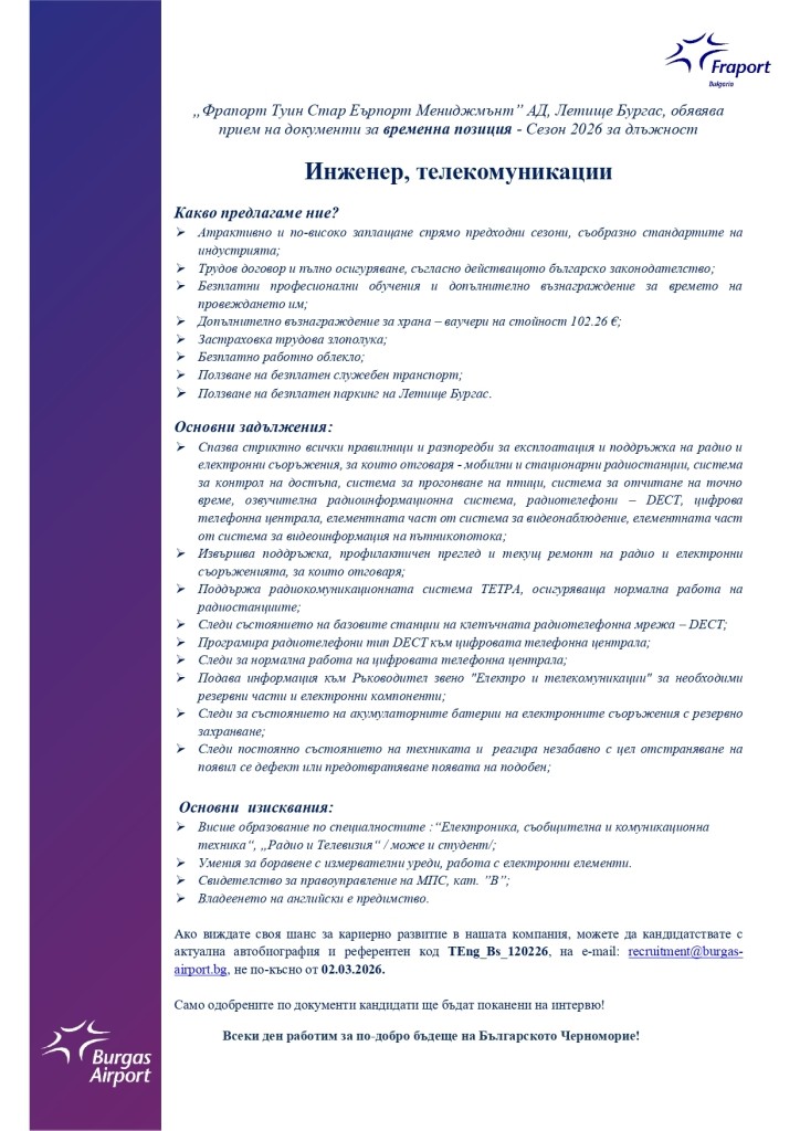 „Фрапорт Туин Стар Еърпорт Мениджмънт” АД, Летище Бургас, обявява прием на документи за временна позиция - Сезон 2026