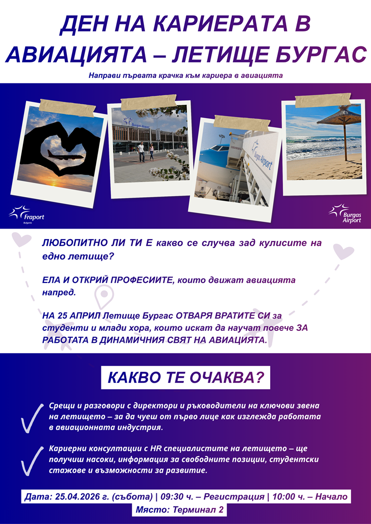 Покана за всички желаещи студенти от Бургаски държавен университет "Проф. д-р Асен Златаров" да се присъединят към първия по своя род Ден на кариерата в авиацията, който се организира на Летище Бургас.