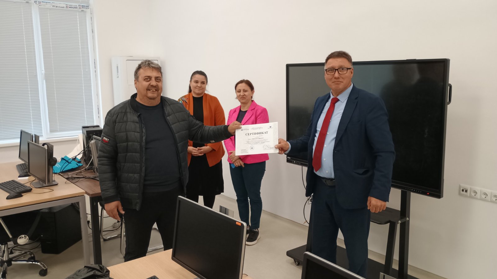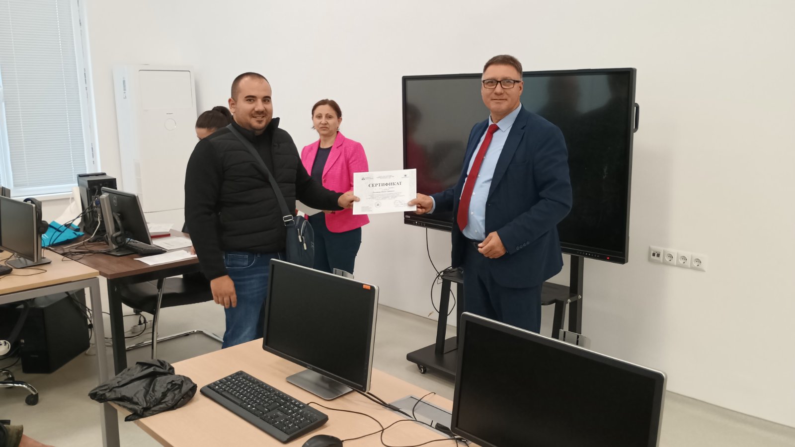На връчването на сертификатите присъстваха зам.-деканът на ФТН и ръководител катедра ЕЕМ доц. д-р инж. Ивайло Беловски, доц. д-р. инж Адриана Георгиева - ръководител на катедра „Химични технологии“ и докторантката инж. Фатме Рамадан, които пожелаха успех на курсистите.