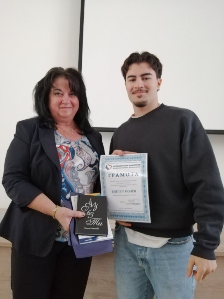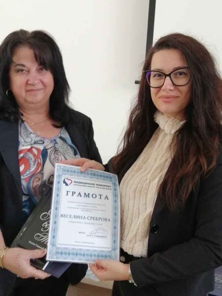 Проф. Янкова връчи грамоти и предметни награди на Кремена Йорданова (III курс), Мирела Петкова и Христия Бейкова (IV курс), както и на студентите от V курс Нина Нинова, Силвена Панева, Веселина Среброва и Марио Христов. За отличен успех бяха наградени и трима студенти от англоезичното обучение – Ан Джоузеф, Аня Майерс и Виктор Колев.