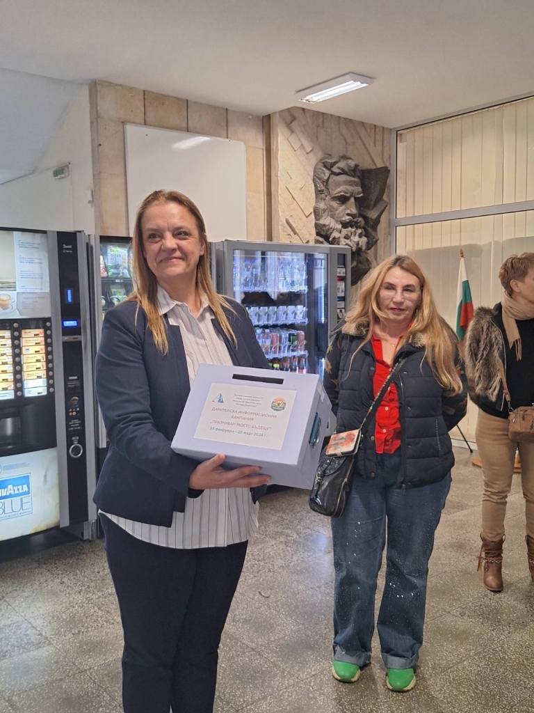 В присъствието на официалните гости проф. д-р Румяна Папанчева – декан на Факултета по обществени науки, и проф. д-р Надежда Калоянова – ръководител на катедра „Педагогика“, поставиха първата дарителска кутия във факултета. Дарителски кутии са разположени във всички основни звена на университета, както и в Учебния отдел и Студентския център.