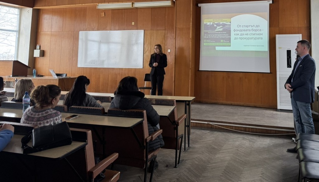 Във Факултета по обществени науки към Бургаския държавен университет „Проф. д-р Асен Златаров“ се проведе практически семинар на тема „От стартъп до фондовата борса – как да не стигнем до прокуратурата“. Форумът бе организиран от катедра „Икономика и управление“ с цел надграждане на знанията, получени по дисциплината „Корпоративно ръководство“, чрез разглеждане на правните и етичните измерения на финансирането чрез публичните пазари на капитал.