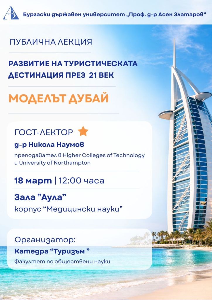 Катедра „Туризъм“ към Бургаския държавен университет „Проф. д-р Асен Златаров“ организира публична лекция на тема „Развитие на туристическа дестинация през 21-ви век: Моделът Дубай“, която ще се проведе на 18 март от 12:00 часа в зала „Аула“ на корпус „Медицински науки“.