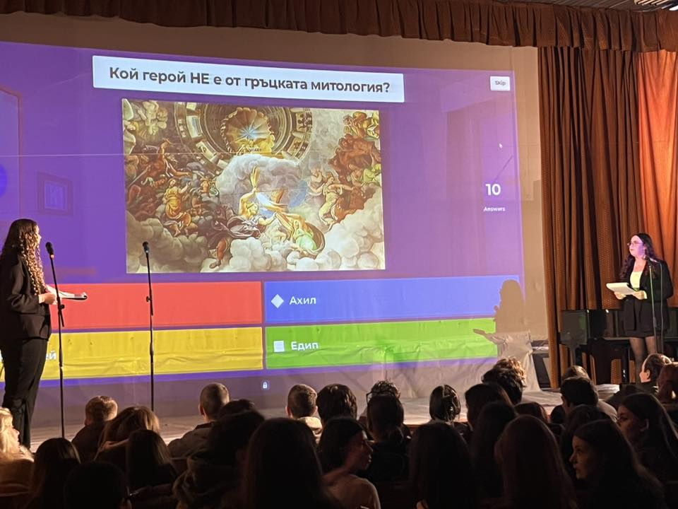 Пред препълнената зала студентите представиха театрален етюд от "Бай Ганьо журналист", който бяха подготвили с помощта на младия режисьор Христо Симеонов и актьора Васил Михалев. Последва литературен куиз, който бе забавна проверка на познанията върху български автори и книги на учениците. Победител в него бе отборът на ПМГ.