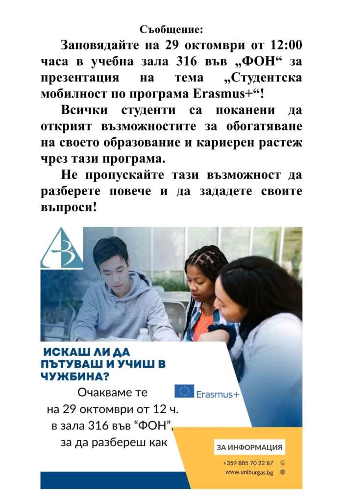 Очакваме ви на 29 октомври от 12.00 ч. в зала 316 във ФОН, където ще ви бъдат представени възможностите на "Студентска мобилност по програма Erasmus+"!