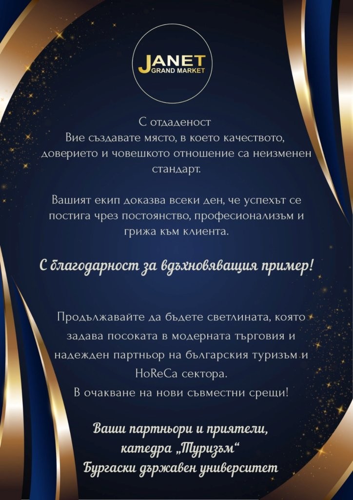 В знак на благодарност за отличното партньорство и съвместната инициатива, катедра „Туризъм“ поднесе благодарствен адрес и специален подарък на JANET Grand Market. В очакване сме на още бъдещи съвместни инициативи, които да вдъхновяват студентите и да надграждат връзката между образованието и бизнеса.